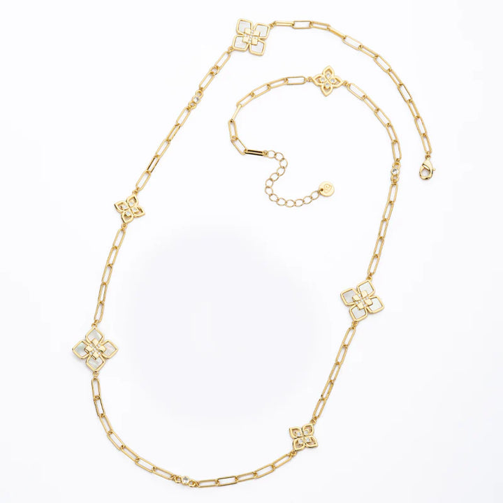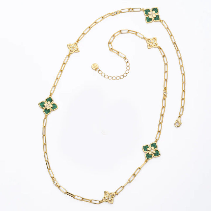#description Collana catena ovalina allungata in brass dorato con elementi in stile veneziano e inserti con punti luce clear.