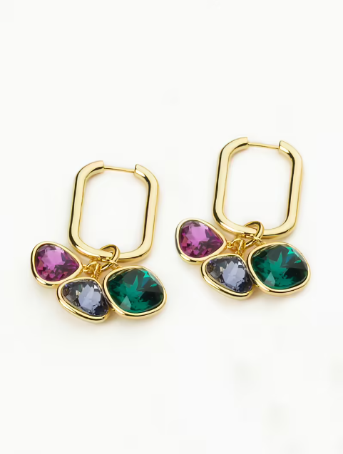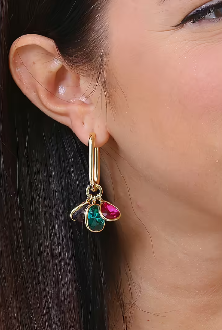 Gioiello in brass anallergico di color oro con cristalli di colore fucsia e ametista e smeraldo. La misura è: 4,5 cm.