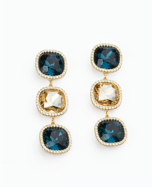 Gioiello in brass anallergico di color oro con cristalli e zirconi di colore blu pavone e champagne e bianco.