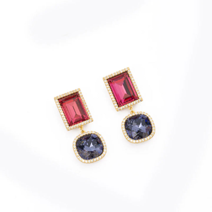 #description Orecchini con cristallo dal taglio baguette magenta e pendente carrè tanzanite con pavè di zirconi clear.