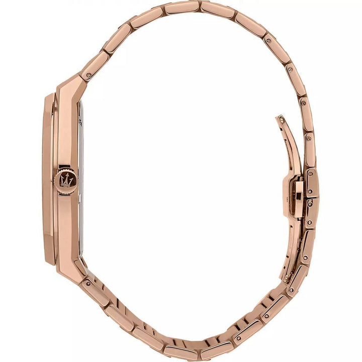 Orologio solo tempo da uomo di maserati della collezione stile. Orologio con cassa in acciaio lucido e satinato di 45 mm con vetro minerale. Bracciale in metallo di colore oro rosa con chiusura a doppia farfalla con pulsanti. Orologio con 3 lancette indici con datario a ore 3 e resistenza all'acqua di 10 atm. La referenza è r8873642007Puoi Pagare con: